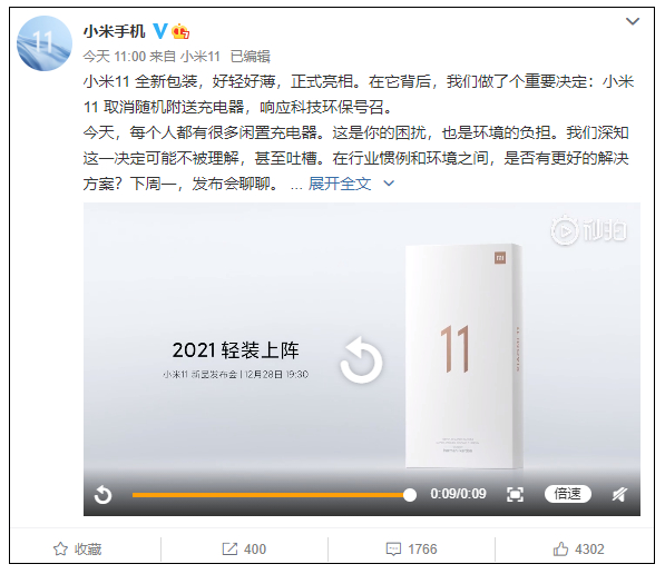 小米也表示“我们深知这一决定可能不被理解,甚至吐槽。在行业惯例和环保之间,是否有更好的解决方案?下周一,小米 11 发布会上我们聊聊。”