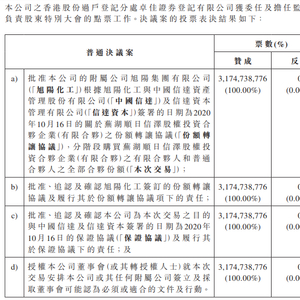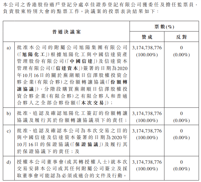 12月23日,中国旭阳集团有限公司召开股东特别大会,出席会议的股东全票通过以人民币48.5亿元收购6家洪业化工企业的各项议案,包括:批准旭阳集团有限公司与中国信达资产管理股份有限公司(以下简称“中国信达”)及信达资本管理有限公司(以下简称“信达资本”)关于芜湖顺日信泽股权投资合伙企业(有限合伙)的份额转让协议,批准中国旭阳与中国信达及信达资本签署的保证协议,以及与上述协议相关的批准事项。