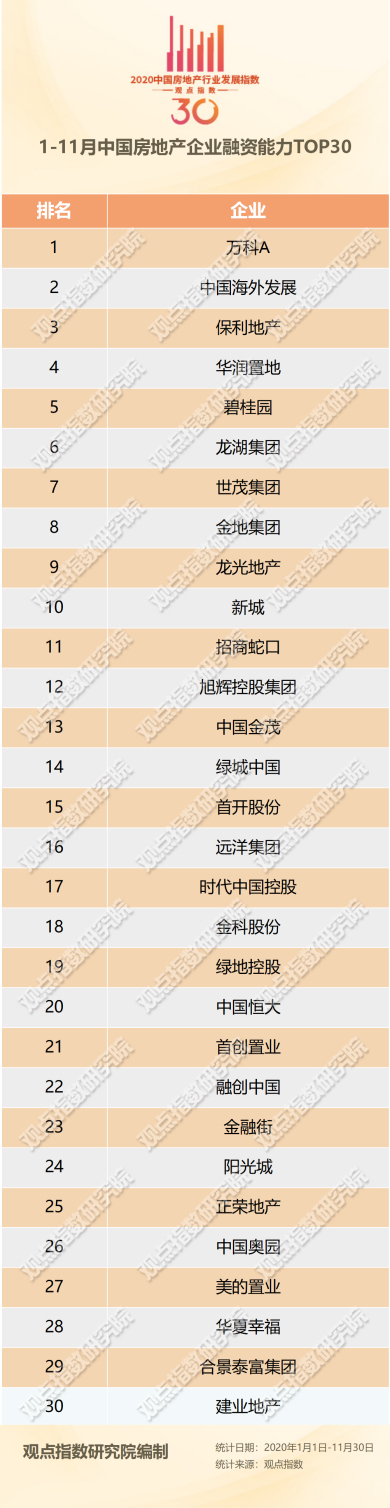 1-11月中国房地产企业融资能力TOP30