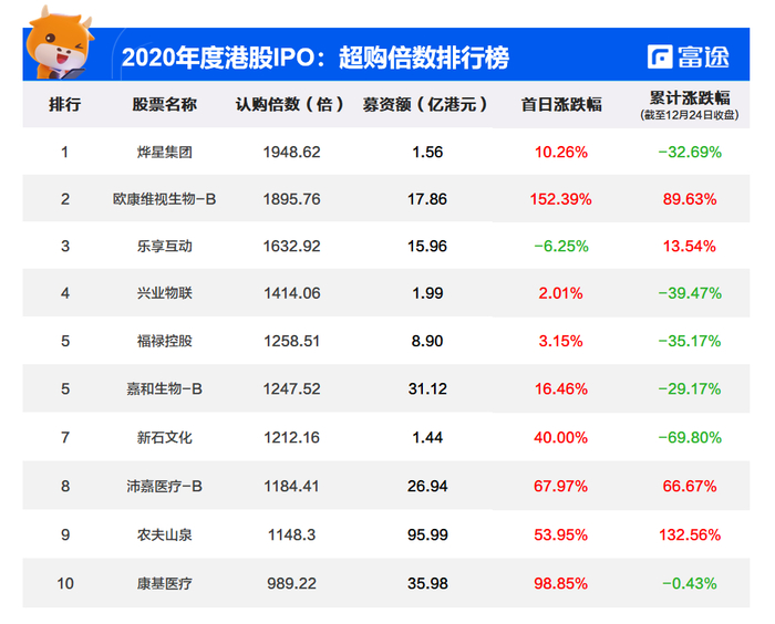 2020年超购倍数靠前的公司还有欧康维视生物、$乐享互动(06988.HK)$、$福禄控股(02101.HK)$、$嘉和生物-B(06998.HK)$、$新石文化(01740.HK)$、沛嘉医疗和农夫山泉,超购倍数都在1000倍以上。相比2019年仅有一只新股超购过千倍,2020年的确是打新的疯狂时代。