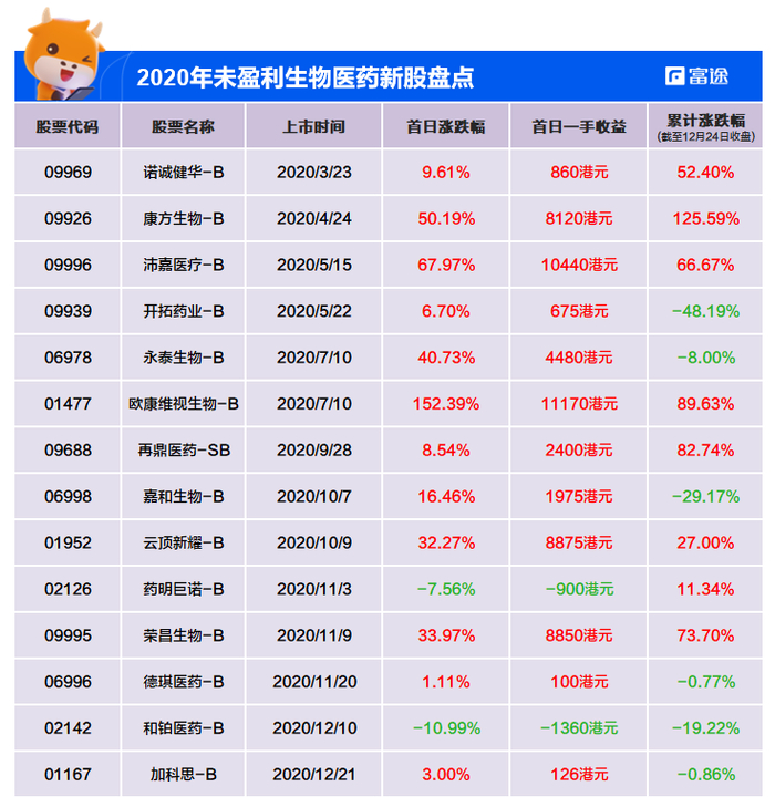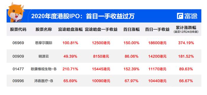 从上市首日收盘来看,2020年首日一手收益过万的新股共有四只,SaaS概念股$明源云(00909.HK)$、生物医药股$欧康维视生物-B(01477.HK)$及$沛嘉医疗-B(09996.HK)$同样是今年的新股黑马,为打新者带来了丰厚的收益。