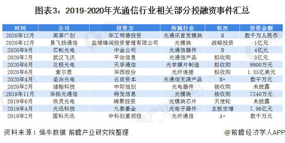 从2019-2020年的主要投融资事件来看,在光通信领域的投融资事件主要发生在光模块/光器件和光芯片方面,这是由于5G产业的加速给光模块/光器件和光芯片市场带来了全新的动力。