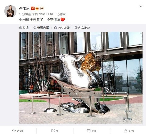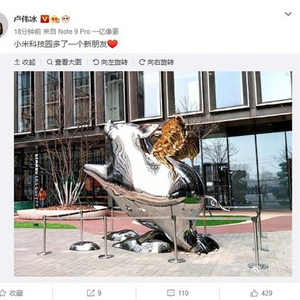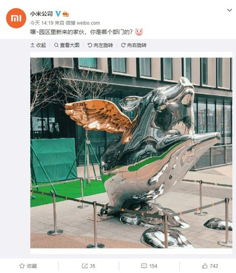 IT之家 1 月 14 日消息 今天下午,小米集团副总裁,中国区总裁,红米 Redmi 品牌总经理卢伟冰微博表示,小米科技园多了一个新朋友。图片显示这是一只飞猪造型的雕塑。