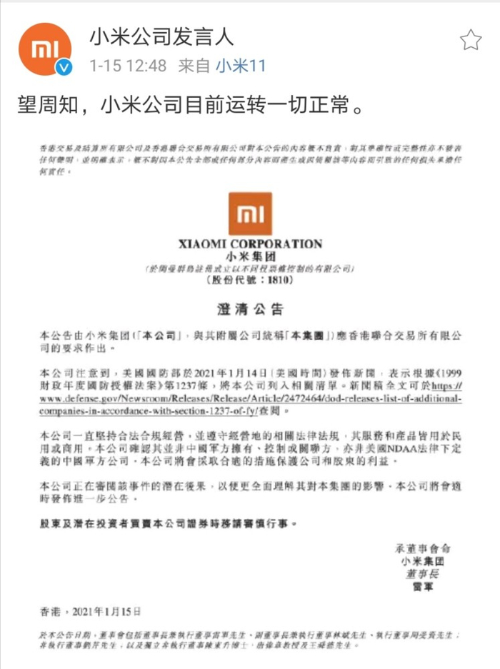 小米集团指出美国政府根据《1999财政年度国防授权法案》第1237条,将本公司列入相关清单,小米集团坚持本公司其服务和产品用于民用或商用,且小米并非中国军方拥有、控制或关联方,亦非美国NDAA法律下定义的中国军方公司。小米将会采取合适的措施保护公司和股东利益。目前小米官微也发布公告称:“小米公司目前运转一切正常。