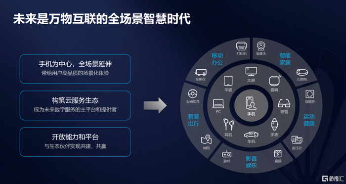华为走的路就是发展 IoT 物联网科技,除了1的手机外,8大智能终端包括有 PC 计算机、平板、电视、音响、头戴式装置、手表、车用仪器、耳机等等。这些装置能够在 N 个场景,包括智能家居、运动、娱乐、流动办公、智慧出行上全面应用。最近,华为进军电动车市场,车联网也是与中软国际合作的。