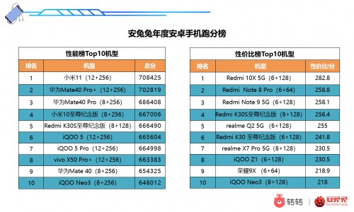 安兔兔安卓手机年度性能榜Top10机型分别为:小米11(12+256)、华为Mate40 Pro+(12+256)、华为Mate40 Pro(8+256)、小米10至尊纪念版(8+256)、Redmi K30S至尊纪念版(8+128)、iQOO 5(12+256)、iQOO 5 Pro(12+256)、vivo X50 Pro+(12+256)、华为Mate 40(8+256)和iQOO Neo3(8+256)