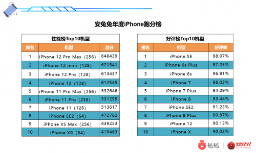 安兔兔iPhone年度性能榜Top10机型分别为:iPhone 12 Pro Max (256)、iPhone 12 mini (128)、iPhone 12 Pro(128)、iPhone 12(128)、iPhone 11 Pro Max (256)、iPhone 11 Pro(256)、iPhone 11 (128)、iPhone SE2(64)、iPhone XS Max(256)和iPhone XR(64)。