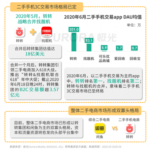 2020年5月,转转和二手手机B2C平台找靓机战略合并。在二手手机3C市场,新合并的转转集团在品牌、供应链和流量等各方面,都已是行业最强;此外,通过提供包括验机、质保等以C2B2C模式为主的履约服务,转转集团也已成为消费者买卖手机的主要渠道。