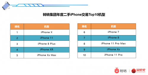 转转集团iPhone年度交易榜Top10机型分别是:iPhoneX、iPhone11、iPhone8 Plus、iPhoneXR、iPhoneXs Max、iPhone7、iPhone8、iPhone11 Pro Max、iPhoneXs、iPhone11 Pro