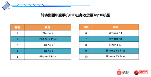 转转集团手机C2B业务年度收货量Top10机型分别为:iPhoneX、iPhone8 Plus、iPhone7、iPhone 6、iPhone7 Plus、iPhone 11、iPhone6s、iPhone XR、iPhone6s Plus、iPhone Xs Max