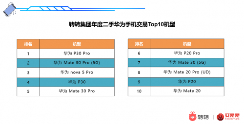值得注意的是,受供货紧张影响,二手市场热销的华为手机普遍为次新款旗舰机型,在转转集团华为手机年度交易榜Top10中,P系列和Mate系列一共占据了9席。