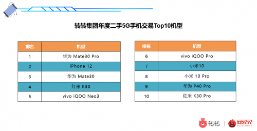 二手市场,转转集团5G手机年度交易榜Top10机型分别为:华为 Mate30 Pro 5G版、iPhone 12、华为 Mate30 5G版、红米 K30 5G、vivo iQOO Neo3、vivo iQOO Pro 5G版、小米10、小米 10 pro (5G)、华为 P40 Pro和红米 K30 Pro