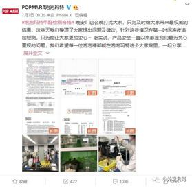 2019年,有网友自己买了甲醛检测仪,私下里对POPMART泡泡玛特几个系列的娃娃进行了检测,得出了甲醛超标4倍的结论,虽然POPMART及时通过检测的手段,通过官微发布声明:其多个系列产品未检出甲醛,同时公布了多份IQTC和CTI出具的检测报告。回应网友其产品安全无毒。