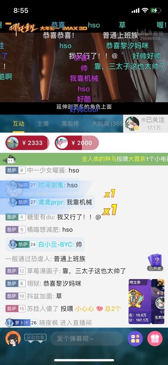 在直播中,电影角色“面具人”和B站虚拟偶像“阿萨AZA”上演了一场别开声面的相声秀。整场直播人气爆棚,弹幕踊跃,“阿萨AZA”的粉丝成为了弹幕互动的主力,“燃”、“面具人我可以”等弹幕语言被粉丝打上公屏,很多B站用户被影片脑洞大开的架空世界设计和东方硬核朋克的画风所吸引,更有很多弹幕直接索要“面具人”的面具销售链接。