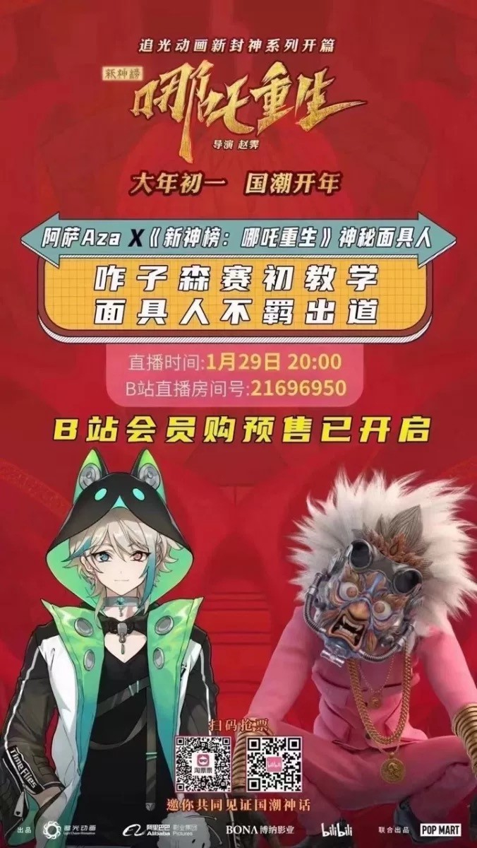 29日,阿里影业“冲击播”与B站的一场跨次元线上路演,让动画新片《新神榜:哪吒重生》中的动画形象“面具人”与B站虚拟偶像“阿萨AZA”同台直播,点燃了Z世代年轻观众群体的热情。