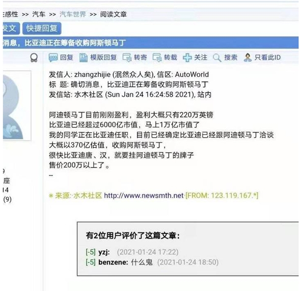 1月26日,有国内论坛爆出比亚迪正在商谈370亿收购阿斯顿·马丁的事宜。从各路媒体引用的图片中看,当时第一眼看到这张图的时候,顿感一切都是熟悉的配方、熟悉的味道,通篇充斥着网络谣言的味道。且不说我同学在XXX任职这种标准网络谣言格式,就连阿斯顿·马丁的名字都没有拼写正确。闹出冒出一个问好:到底是谁在炒作?还是真有其事?莫非最终实现我们国民超跑梦的不是“皮尺部”众泰,也不是“抄袭王”汉龙,而且是比亚迪!