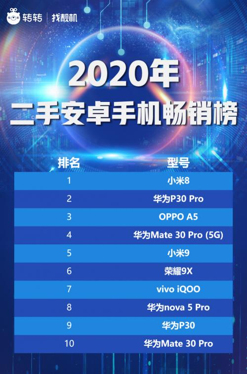 与此同时,转转集团年度二手安卓手机交易量榜单中,小米8力压华为P30Pro、OPPO A5等机型,连续四个季度蝉联榜首宝座。华为P30 Pro、OPPO A5、华为Mate 30 Pro (5G)、小米9、荣耀9X、vivo iQOO、华为nova 5 Pro、华为P30、华为Mate 30 Pro紧随其后。其中,华为手机有五款上榜,是此次排名中最多的手机品牌。
