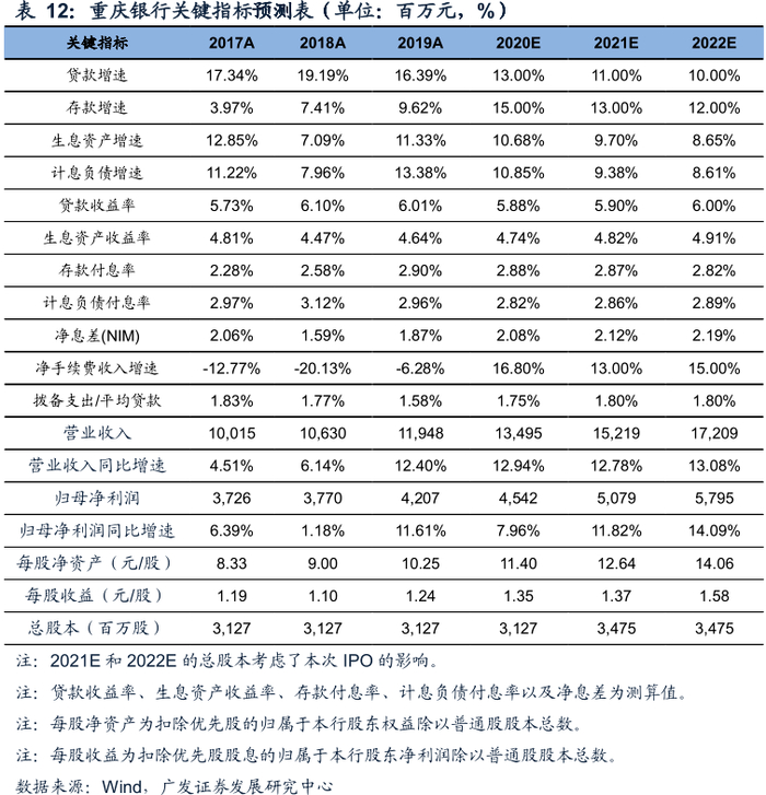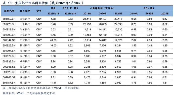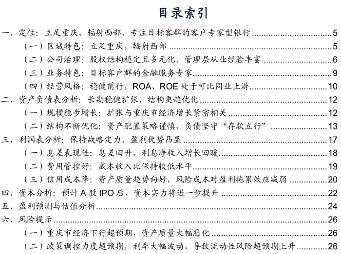 核心观点定位:立足重庆,辐射西部,专注目标客群的客户专家型银行。重庆银行一直立足打造“客户专家型银行”的战略定位,零售业务转型加快推进、公司业务从传统信贷业务逐步向专业化行业金融服务商转型、小微业务致力成为区域内小微金融服务的先行者、资金业务回归本源。公司股权结构稳定且多元化,管理层较为稳定,高管从业经验丰富,为战略贯彻执行和稳健经营奠定了基础。公司以重庆为中心,对四川省、陕西省和贵州省三个西部省份形成辐射,不断实现跨越式发展,逐渐成为了中国西部地区领先的综合性城市商业银行。目前ROA、ROE均处于可比同业上游。资产负债表分析:长期稳健扩张,结构更趋优化。重庆银行的规模增长表现出与重庆市经济增速的高度关联性,主要源于公司的业务集中在重庆地区且经营风格稳健。2020Q2以来,重庆市经济逐渐复苏,公司规模增长也呈现出向好的势头。结构来看:资产配置策略谨慎,信贷和金融投资是主要配置方向,贷款投放重点向资本节约型的领域倾斜,包括零售贷款和小微企业贷款;金融投资中高流动性、低资本消耗的标准化债权资产的规模和占比均在提高。负债坚守“存款立行”经营理念,资金来源以存款为主,结构上零售存款贡献快速提升。利润表分析:保持战略定力,盈利优势凸显。重庆银行坚守战略定位,盈利能力在可比同业中具备一定优势。具体表现在:(1)资产负债结构不断优化助力息差回升至可比同业前列;(2)得益于持续强化的成本费用管理,成本收入比处在同业较低水平;(3)资产质量主要指标趋势向好叠加拨备安全垫较厚,促进信用成本的下行,对盈利的负面效应减弱。2019年下半年以来,公司的营收、PPOP、归母净利润增速中枢有所抬升,其中2020年前三季度业绩增速处于可比同业上游。盈利预测和合理价值:重庆银行保持战略定力,深耕目标客群,在深挖自身潜力中稳健前行。预计2020-2021年归母净利润分别同比增长8.0%、11.8%;考虑本次A股IPO摊薄影响,预计2020-2021年每股收益分别为1.35元、1.37元/股,每股净资产分别为11.48元、12.64元/股。根据招股说明书,公司每股发行价格10.83元/股,对应2020-2021年PE分别为8.01X/7.90X,PB分别为0.94X/0.86X。参考当前A股上市城商行PB估值水平,结合公司基本面,给予重庆银行A股2021年1.0X-1.2XPB,对应的每股合理价值为12.64-15.17元/股。风险提示:(1)重庆市经济下行超预期,资产质量大幅恶化;(2)政策调控力度超预期,利率大幅波动,导致流动性风险超预期上升。