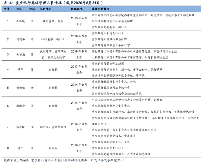 董事长、行长较为稳定,管理层从业经验丰富。自2006年以来,重庆银行经历过四任董事长和两任行长,总体来说比较稳定。高级管理层方面,截至2020年8月末,重庆银行共有8名高级管理人员,从过往主要履历来看,重庆银行高级管理层大多具有丰富的金融行业从业经验,这为重庆银行的稳健经营奠定了基础。