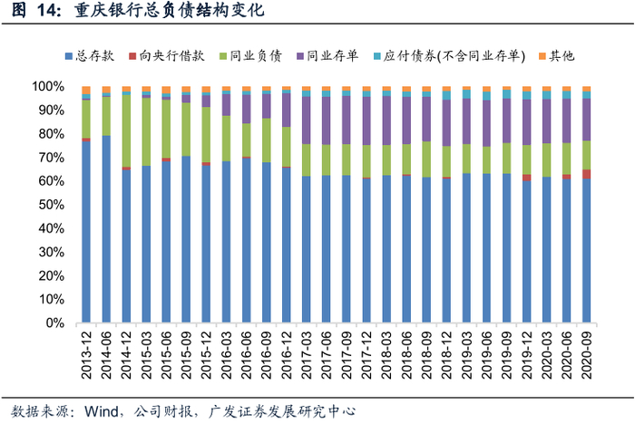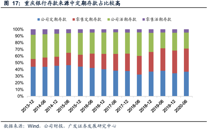 负债来源以存款为主,零售存款贡献快速提升。重庆银行一直坚守“存款立行”的经营理念,负债资金主要来自存款,同时也合理安排了同业存单、应付债券等市场化资金,拓展负债来源。从存款结构来看,近几年:(1)在重庆市非金融企业存款增长动力不足且定期化趋势加重的背景下,重庆银行的公司存款对总存款的贡献度下降,对公定期存款占总存款的比重上升。(2)随着理财资金分流作用减弱,重庆市的住户存款增长较快,重庆银行抓住机遇,在零售转型战略的推动下,发挥区域品牌优势,加快产品创新,零售定期存款规模增长明显,零售存款的贡献持续提升。