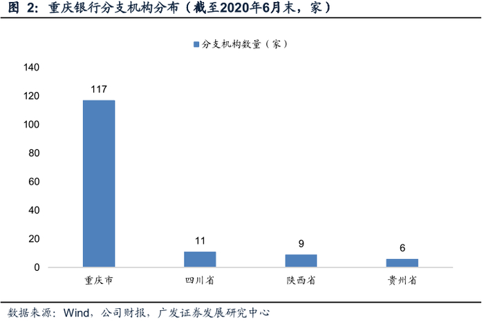 重庆银行业务目前主要集中在重庆市,同时向周边省市延伸,积极推进跨区域经营。截至2020年6月末,公司设有包括总行营业部、小企业信贷中心以及4家一级分行在内的共计143家分支机构,网点覆盖了重庆地区所有38个区县,并在四川省(成都市、广安市、乐山市)、陕西省(西安市、延安市)和贵州省(贵阳市、遵义市、毕节市、六盘水市)等地设立了26家异地分支机构。2020年6月末,重庆银行总资产、总贷款、总存款中重庆市本地占比分别为89.1%、78.7%、85.8%。