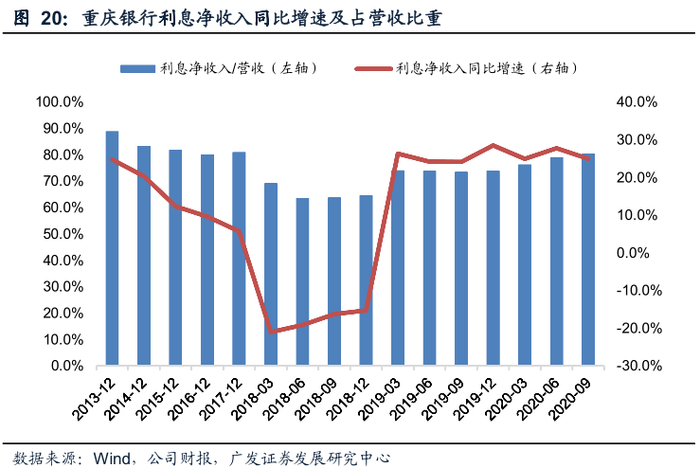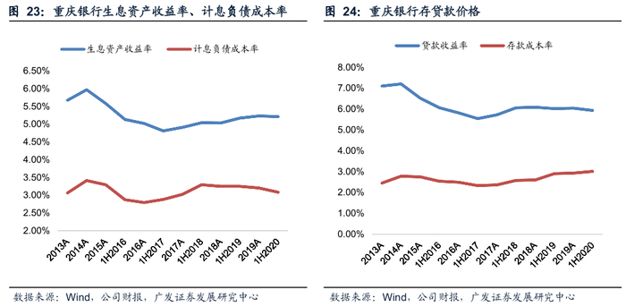 息差回升叠加规模稳步增长,2019年以来利息净收入增长较快。利息净收入是重庆银行营收主要来源,长期以来均能实现正增长(2018年除外,负增长主要是IFRS9实施导致口径变化,可比口径下仍是正增长)。2019以来,利息净收入增速保持在20%以上,一方面是由于生息资产规模扩张,另一方面则是得益于息差改善。2020年上半年重庆银行的息差同比提升25BP至2.24%,在A股上市城商行中排名第4位。