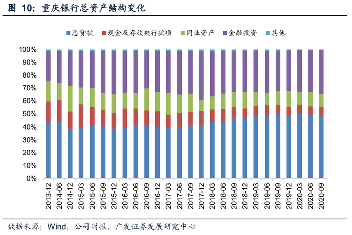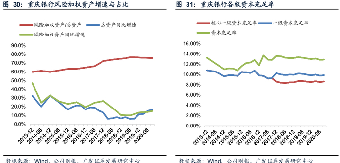 根据《商业银行资本管理办法(试行)》,重庆银行至少要满足非系统重要性银行的监管达标要求,即每年末的核心一级资本充足率、一级资本充足率和资本充足率分别不得低于 7.5%、8.5%和 10.5%。近年来,虽然重庆银行保持了较强的资本内生能力,随着信贷占比的提高,风险加权资产/总资产比值上行,核心一级资本率中枢有所下行。截至2020年9月末,公司的核心一级资本充足率、一级资本充足率和资本充足率分别为8.65%、9.86%、12.90%,较上年末分别+0.14PCT、+0.04PCT、-0.10PCT,各级资本充足率均高于最低监管要求,资本实力在A股上市城商行中略微偏弱。