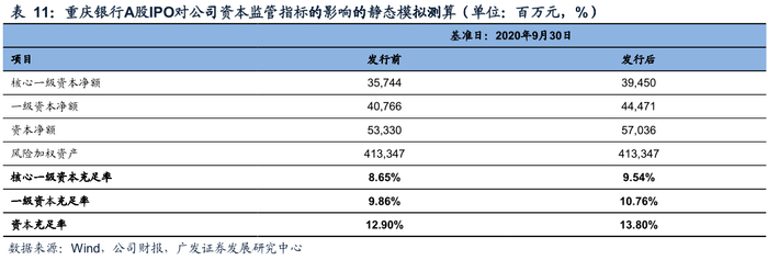 预计本次A股IPO完成后,公司的监管安全边际和风险抵御能力将进一步提高。据我们测算,以重庆银行2020年9月30日的财务数据为基础,按照公司2020年12月30日发布的招股说明书中披露的预计募集资金净额370,529万元,A股IPO后预计提升各级资本充足水平0.9PCT。