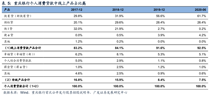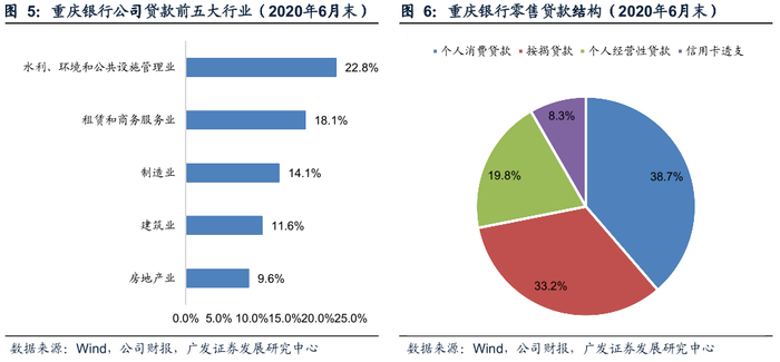 从贷款构成来看:2020年6月末,重庆银行总贷款中公司贷款占比58.8%,公司贷款主要集中在水利、环境和公共设施管理业、租赁和商务服务业、制造业、建筑业及房地产业,以上行业的贷款分别占公司贷款的 22.8%、18.1%、14.1%、11.6%和 9.6%,从公司贷款客户类型来看,小微企业贷款占公司贷款的比重为41.9%;零售贷款中个人消费贷款与按揭贷款并重,占零售贷款的比重分别为38.7%、33.2%,其中个人消费贷款已经形成了线上消费贷款产品(包括“微粒贷”、“快 E贷”、“快I贷”、“捷e贷”等)为主,与传统消费贷款产品(包括“幸福贷”和个人综合消费贷款等)结合的丰富产品体系。