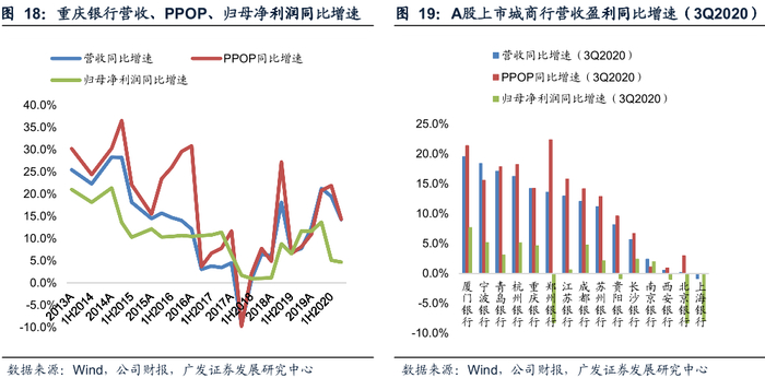 重庆银行坚守战略定位,盈利能力在可比同业中具备一定优势。具体表现在:(1)资产负债结构不断优化助力息差回升至可比同业前列;(2)得益于持续强化的成本费用管理,成本收入比处在同业较低水平,成本管控能力良好;(3)信用成本对利润的拖累效应降低。2019年下半年以来,公司的营收、PPOP、归母净利润增速中枢总体有所抬升。疫情背景下,2020年前三季度,营收、PPOP仍实现了双位数增长,同比增速分别为14.2%、14.3%,拨备计提力度加大,归母净利润增速为4.7%。