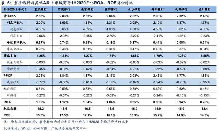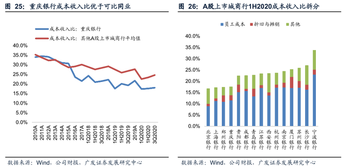 成本收入比保持低于可比同业平均的水平。重庆银行1H2020成本收入比为17.6%,在A股上市城商行中仅高于 北京银行 、 上海银行 和 郑州银行 。主要是由于重庆银行近年来在保持营收提升的同时严格控制成本支出,提升了经营效率和精细化管理水平。例如:推行网点服务智能化、轻型化转型,降低运营成本;借助互联网大数据,推广纯线上营销产品,同时与第三方合作线上业务,线上业务、线下业务双轨运行,降低营销成本。对比A股上市城商行1H2020成本收入比的结构上,除了折旧与摊销外,重庆银行的员工费用和其他费用管控均明显好于同业。