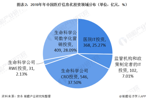 近年来,我国政府出台多项政策推动国家医疗信息化建设,我国医疗信息化投资规模不断扩大,根据安永发布的报告显示,2019年我国医疗信息化投资总额达1456亿元,预计到2024年我国医疗信息化投资总额将增加至3567亿元,2014-2019年复合增长率达19.6%。目前我国医疗信息化投资的主要领域为医院IT投资、监管机构和政策制定者的IT投资、生命科学公司CRO投资、生命科学公司的RWE投资、生命科学公司数字化营销投资。