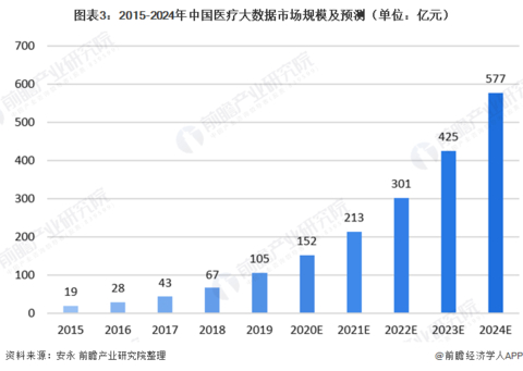 医疗大数据解决方案市场高速增长随着医疗卫生信息化建设进程的不断加快,我国医疗数据的类型和规模也在以前所未有的速度迅猛增长,医疗大数据解决方案市场规模随之高速增长。根据安永发布的报告显示,2019年我国医疗大数据解决方案市场规模达105亿元,预计到2024年我国医疗大数据解决方案市场规模将增加至577亿元,2014-2019年复合增长率高达40.5%。