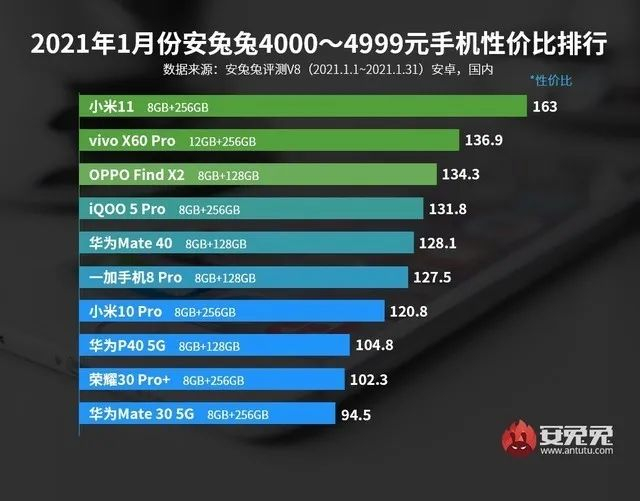 4000-4999元性价比Top10:小米11、vivo X60 Pro、OPPO Find X2、iQOO 5 Pro、华为Mate 40、一加8 Pro、小米10 Pro、华为P40、荣耀30 Pro+、华为Mate 30 5G。