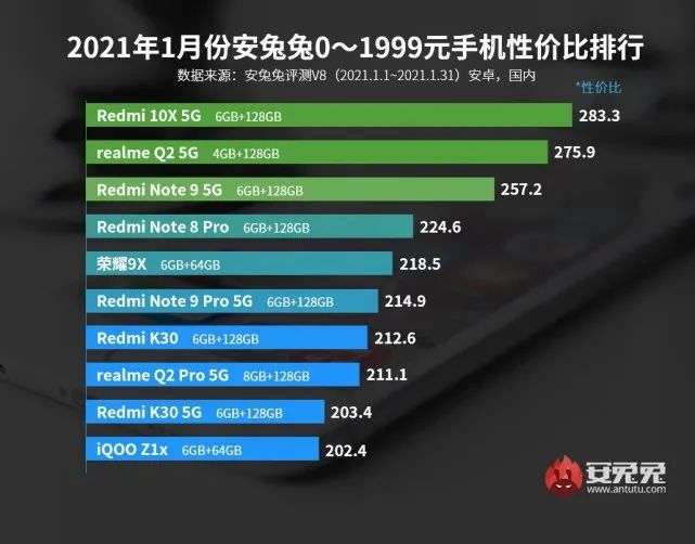 近日安兔兔就正式发布了2021年1月份安卓手机性价比排行榜,我们一起来看看具体的排名: