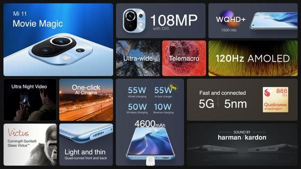 其他方面,小米11搭载6.81英寸AMOLED四曲面屏,通过DisplayMate A+认证,支持2K+120Hz,峰值亮度达到1500nit以及支持10亿色彩显示;后置1亿像素主摄、1300万像素超广角摄像头和500万长焦微距摄像头;内置4600mAh电池,支持55W有线秒充、50W无线秒充和10W反向充电;配备立体声双扬声器,由harman Kardon调音。