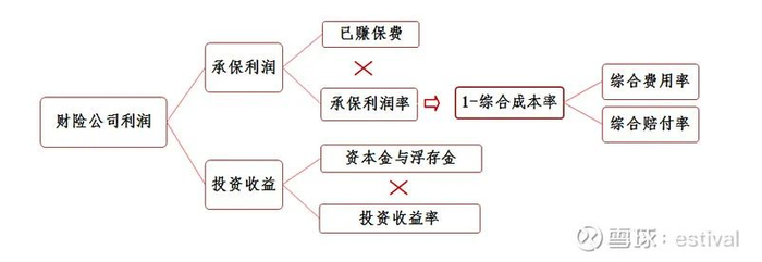 这里先简单总结下财险的利源模式。不同于寿险,财险产品基本上都是一年期以内,收支和盈利可以在1-2个会计年度内确认完,所以财险公司的报表更简单,更接近实体行业。财险公司税前利润分为两块,一块是承保利润,等于当期的保费流量*(1-综合成本率),一块是投资收益,等于存量的资产乘以当期的投资收益率。如果综合成本率小于100%,一定程度上可以认为财险公司是以负的资金成本在进行投资。