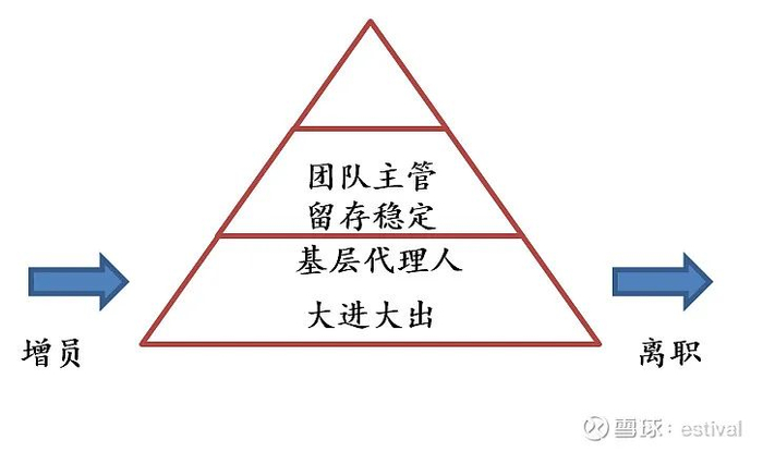 既然寿险行业还有增长空间,互联网渠道也不会带来显著冲击,平安的寿险转型是否还有必要?过去二十年来,包括平安在内,多数寿险公司使用的都是金字塔式的代理人模式。这种模式的核心理念是招代理人就是招客户。每新招一个代理人进来,新人先自己买一件保单,然后把自己的亲朋好友也安利一遍。最后如果这个代理人发展为成为一个营销高手,他可以留存下来。但更一般的情况是,再把周围的缘故关系挖掘完之后,代理人就很难去拓展新客户,最终脱落。而基层代理人之上的团队主管,可以层层地去抽佣。所以他们只需要不断发展新人,就可以稳定地待在公司。