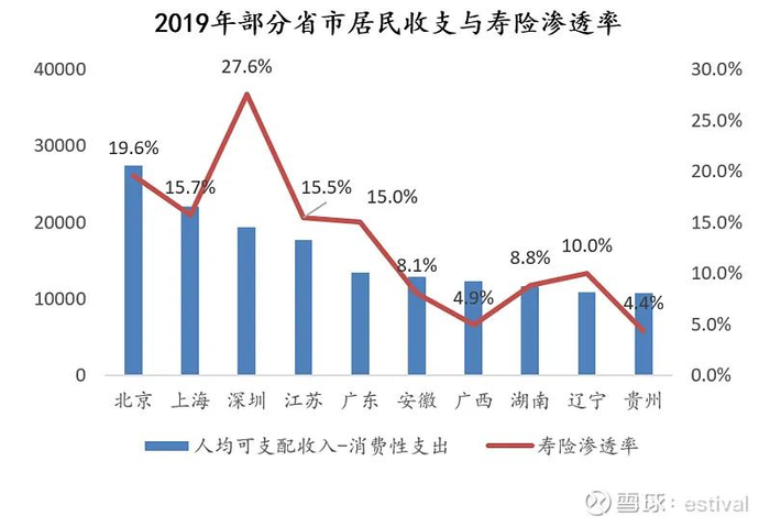 更有参考意义的是比较国内不同省市的情况,这样可以过滤掉其他因素,看出经济发展水平对寿险渗透率的影响。我个人习惯用(居民年可支配收入-年消费)作为分母去看保险的渗透率,这更符合一般居民购买寿险的逻辑。在这个口径下,过去10年,内地的寿险渗透率从10.9%提升到了14.2%。