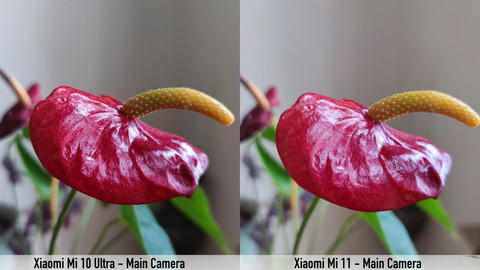 这组依然是以花朵作为被拍摄对象的照片对比中,可以看到小米10至尊版和小米11雷军签名版之间,将花瓣的表面纹路和颜色效果表现,呈现除了完全不同的状态。小米10至尊版拍摄的花朵颜色深,同时花瓣表面的纹路几乎看不清楚。小米11雷军签名版拍摄的花瓣颜色浅,并且花瓣上的纹路几乎清晰可见,两者之间的区别也十分明显。