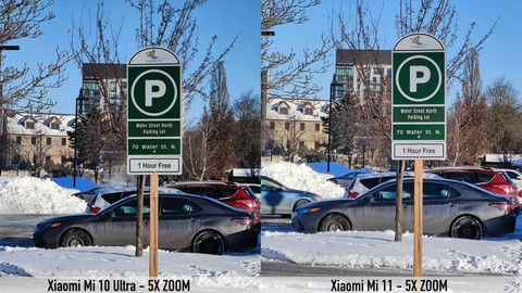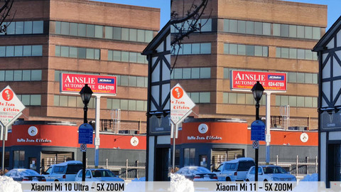 在变焦5倍的状态下进行的拍照对比,可以看到小米10至尊版和小米11雷军签名版之间在路牌的颜色方面还是有着非常明显的区别。小米10至尊版拍摄的照片中,路牌的颜色更加深一些,呈现的是深绿色。小米11雷军签名版拍摄的照片中,路牌的颜色则呈现出来浅绿色。除了路牌的颜色区别比较明显之外,远处的汽车的车身颜色也呈现除了明暗不同的状态。