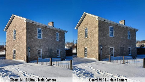 在室外光线较为充足的环境中,小米10至尊版和小米11雷军签名版拍摄的建筑物作为对象,可以看到建筑物外表面的区别也是比较明显的。小米10至尊版拍摄的建筑物外表面,依然是属于曝光度较低的一个状态。而小米11雷军签名版拍摄的建筑物外表面则明显要更加明亮,但是建筑物外表面暗一些的优势是砖块之间的纹路显得清晰一些,而亮度较高则会让建筑物外表面的砖块纹路不够清晰。