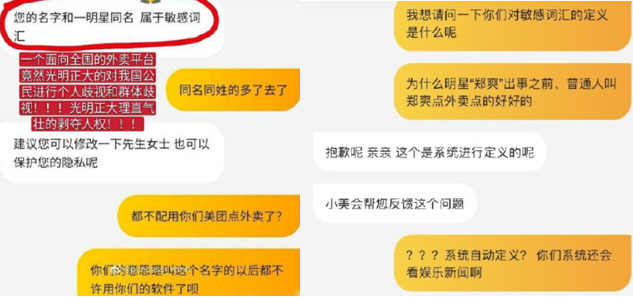 事实就是如此,外卖平台封杀“郑爽”二字,迫使名叫“郑爽”的消费者必须改名才能点餐的行为,严重侵犯了消费者的人权。这是外卖平台表现。