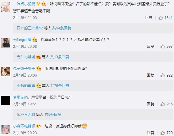 不少网友也对外卖平台的做法表示无语,调侃表示“叫郑爽的不能点外卖,想点餐还得改名字”是自己听过最好笑的笑话。