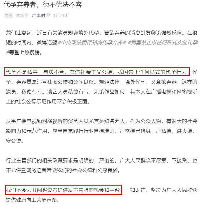 1月20日,广电总局旗下官媒广电时评发文《代孕弃养者,德不优法不容》,在文章末尾广电总局明确表示不会为其提供发声露脸的机会和平台。