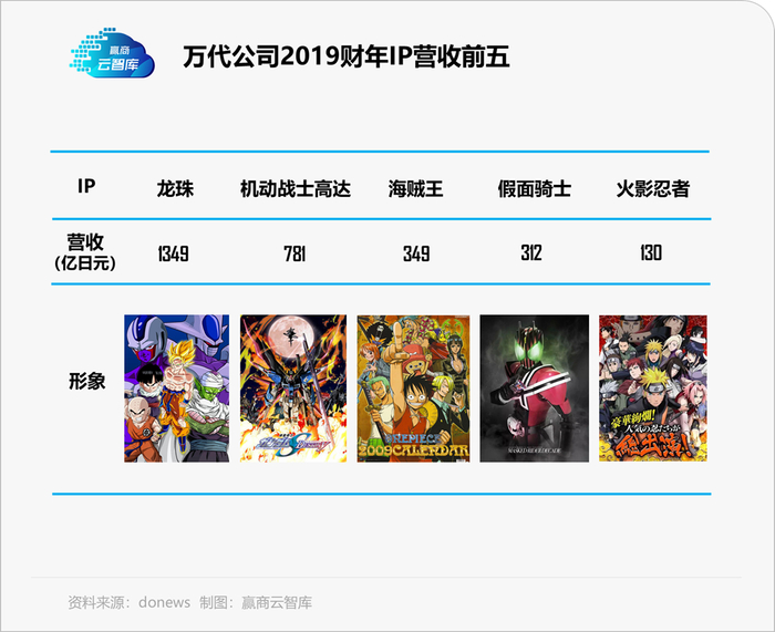 日本市场占有率最高(57.5%)的万代,凭借“筋肉人橡皮擦”掀起了第一波扭蛋热潮,并手握机动战士高达、假面骑士、龙珠、海贼王等知名IP。以IP为中轴,进行游戏、玩具、音乐、娱乐场所的开发,游戏成为了其核心的业务来源。