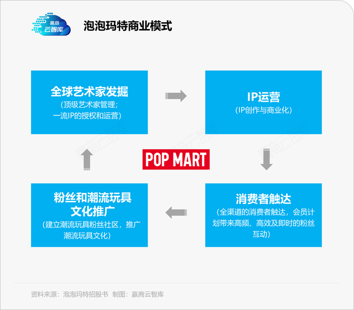 立于武林之巅,泡泡玛特的另一秘籍是潮玩全产业链布局——集潮流商品销售、艺术家经纪、衍生品开发与授权、互动娱乐和潮流展会主办于一体。