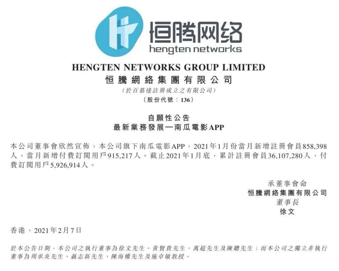 2月7日,恒腾网络发公告,旗下南瓜电影APP一月新增注册会员85.8万人,累计注册会员达3610.7万人;一月新增付费会员91.5万人,累计付费用户592.7万人;一天后,恒腾网络股价高开高走,大涨49%。
