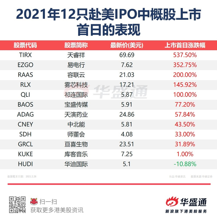 其中包括天睿祥、易电行、雾芯科技、容联云等12家中概股在美上市,且在上市首日取得不小的涨幅。其中天睿祥上市首日收涨537.50%、易电行上市首日收涨352.75%、容联云上市首日收涨200%、雾芯科技上市首日收涨145.92%等,让投资者赚的盆满钵满。