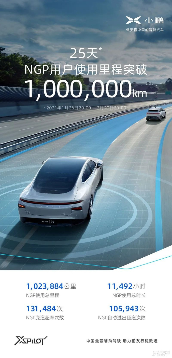 事件回顾:2月22日,,小鹏汽车公布了NGP自动导航辅助驾驶功能的相关数据。根据小鹏汽车公布的数据,NGP在1月26日至2月20日期间,总使用里程为1023884公里,使用总时长11492小时,实现变道超车次数为131484次,进出匠道次数为105943次。